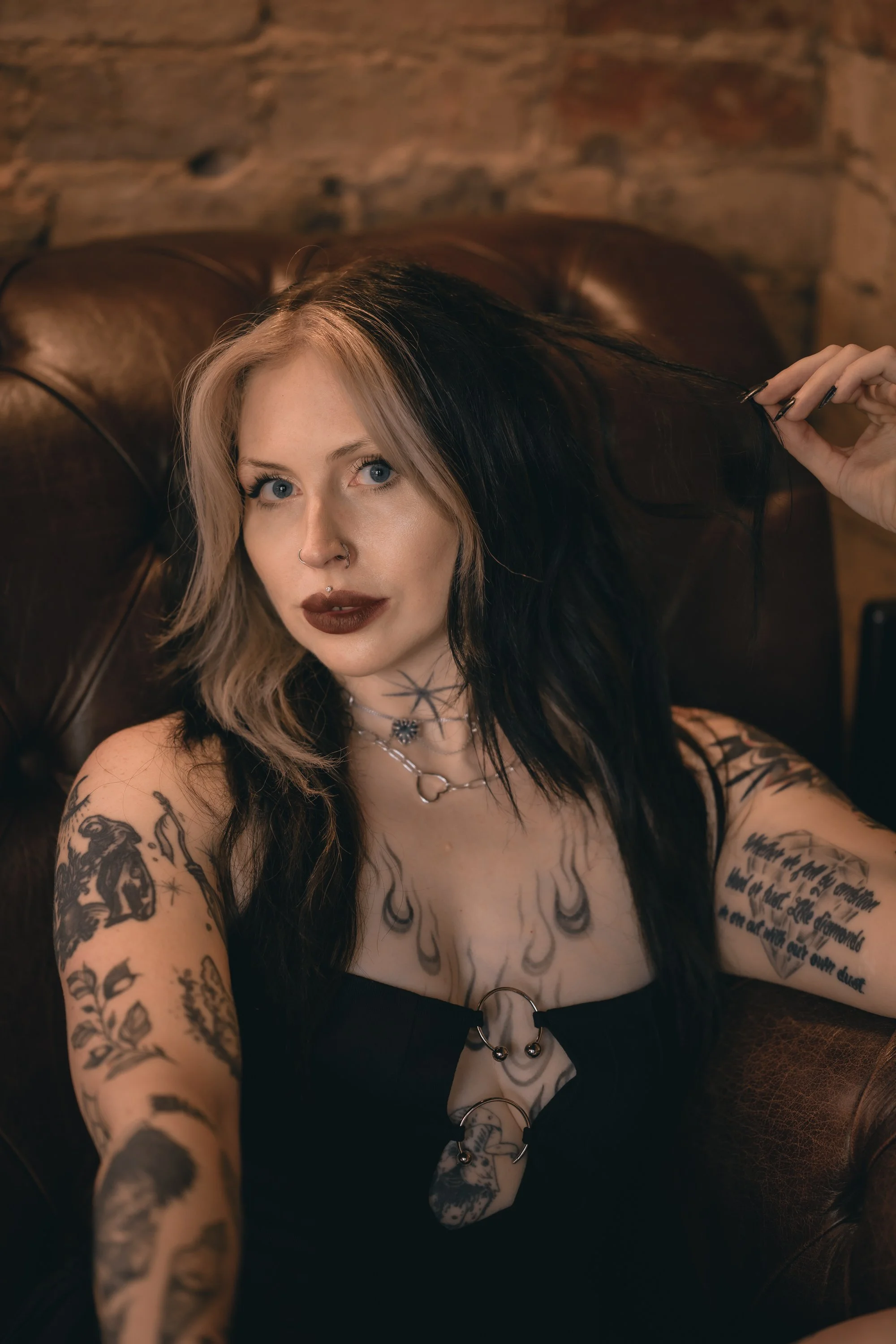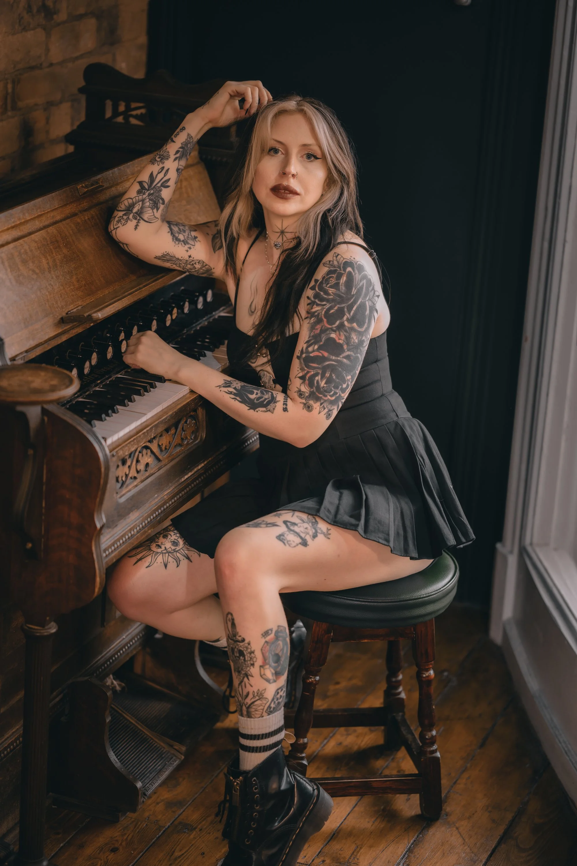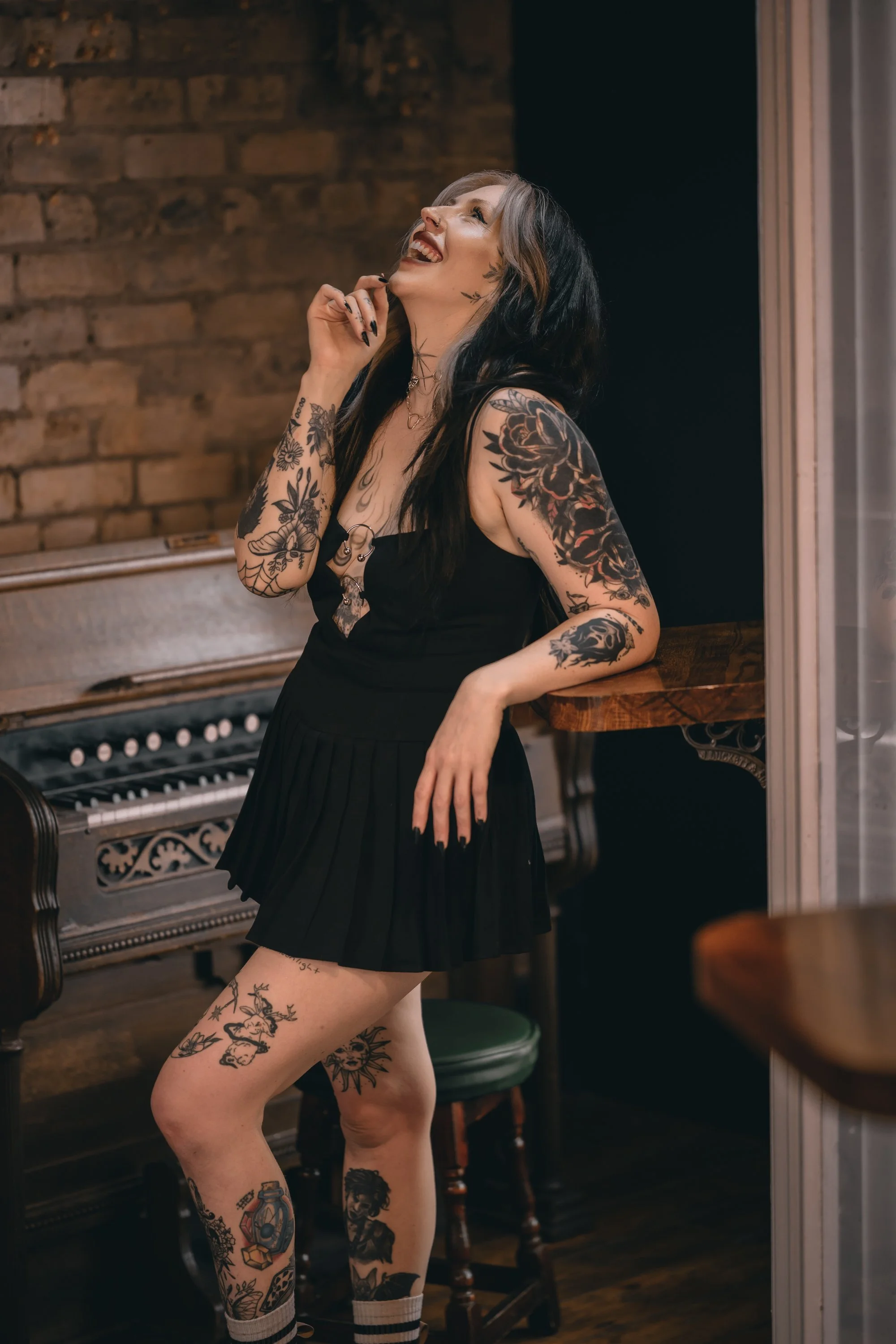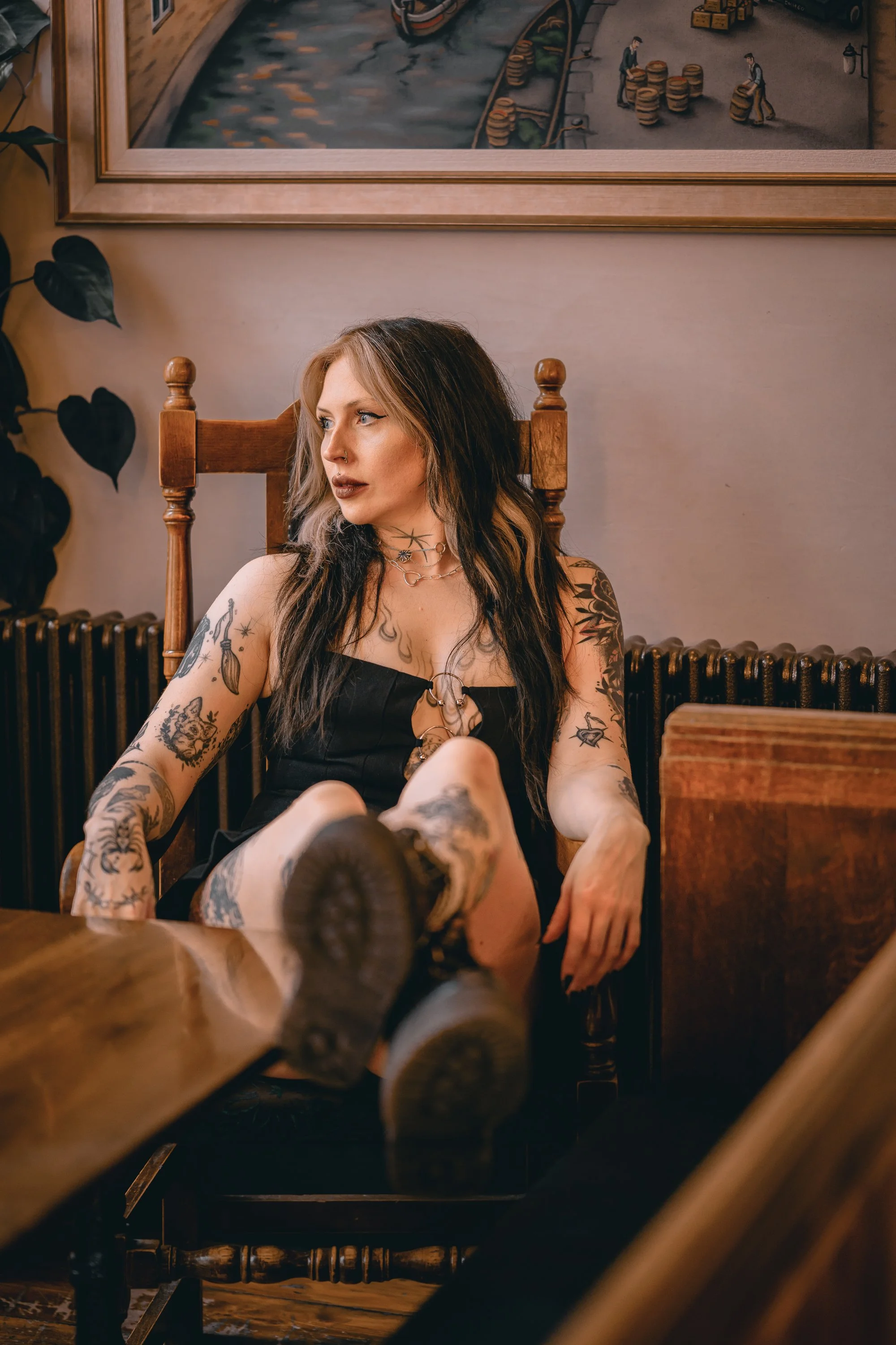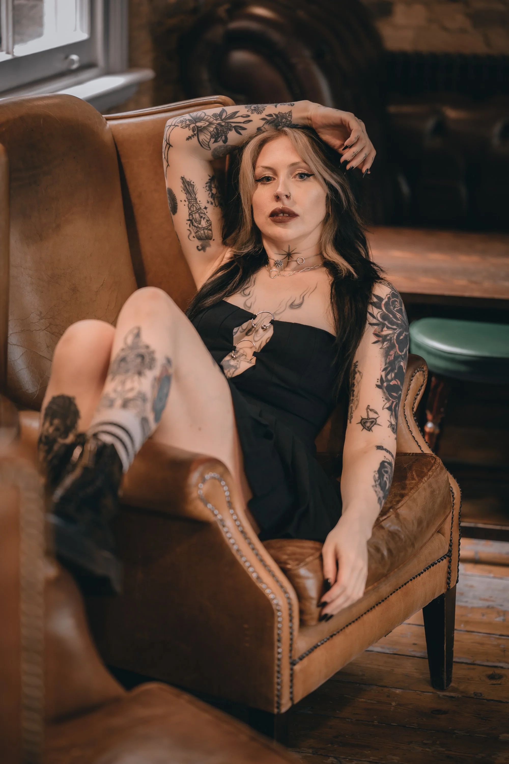 Upstairs has a function room which was cordoned off, but Will (because he is amazing) said we could use the space. I spotted this rose arch by the door and could already picture the shots I wanted to take. Meg looks insane, especially in this first image because everything just works. The positioning of Meg in the doorway, her tattoos and hair, stunning face and makeup, and not to mention the soft light from the window behind helping her stand out. We explored every inch of the upstairs (except the toilet for obvious reasons) and even the challenge of the orange-y bulbs above the table wasn’t going to stop me getting the shots I wanted.