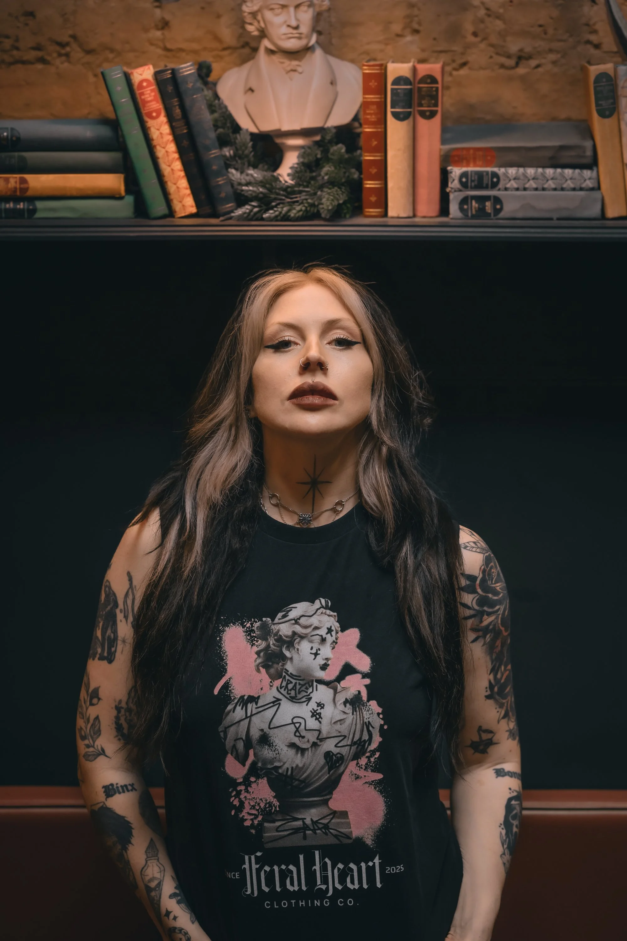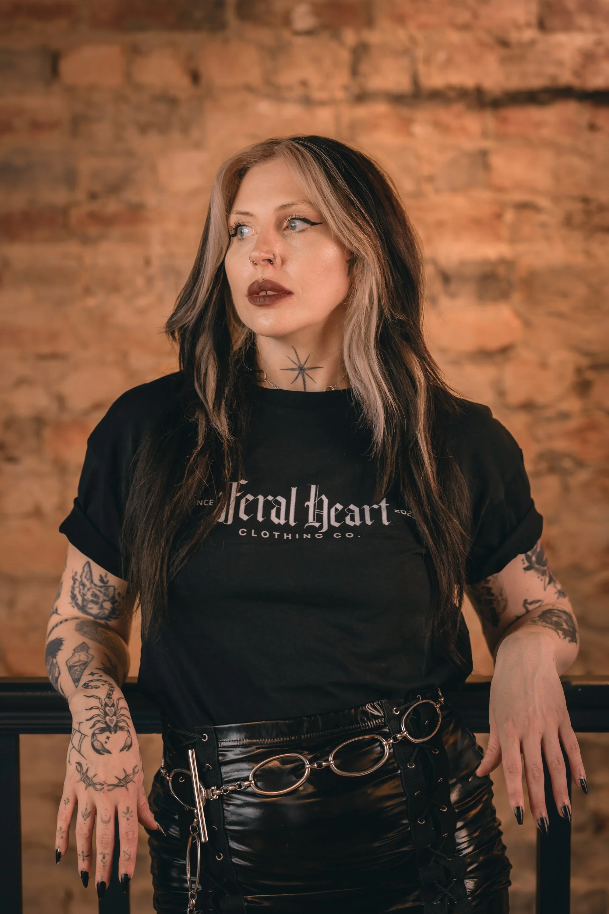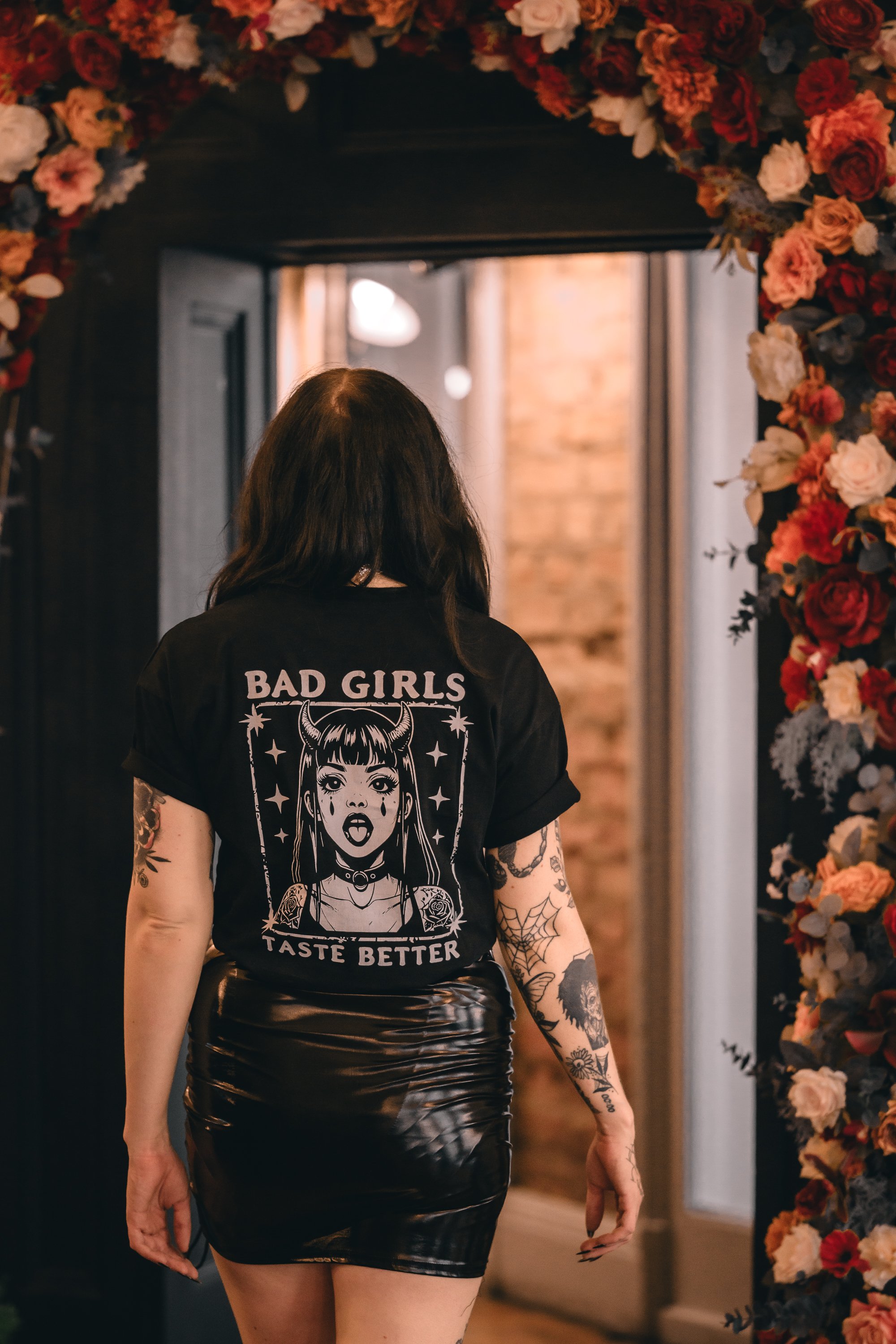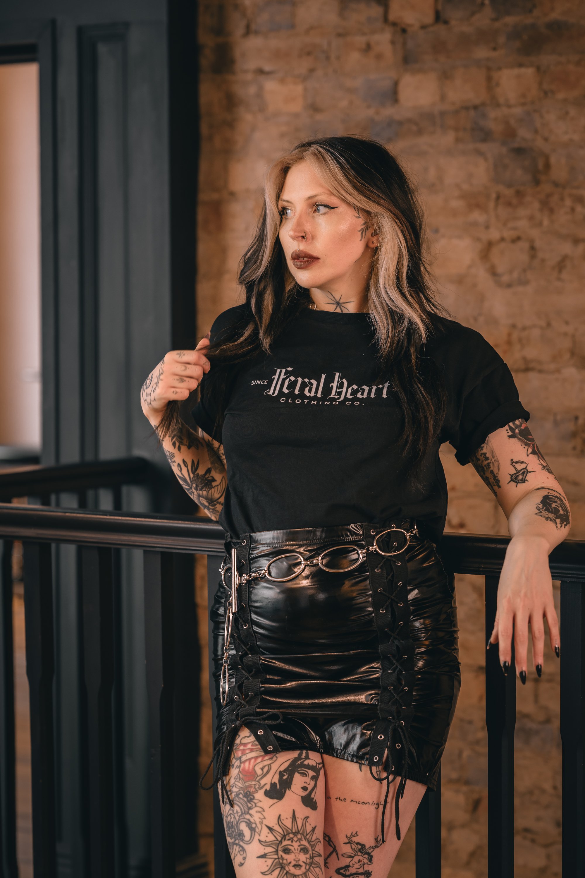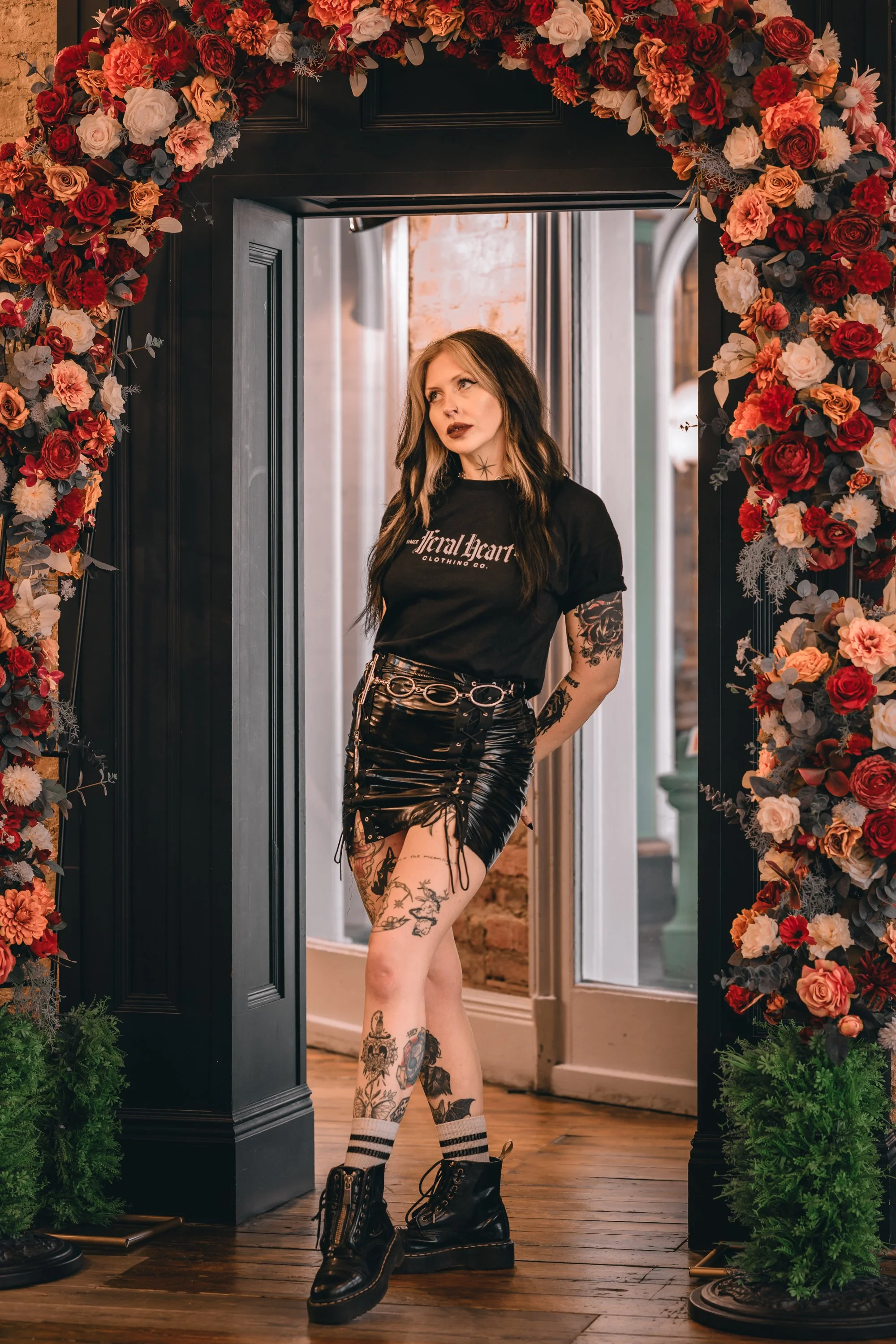 When planning the shoot Meg had posted asking if any brands would like to collaborate with us and she had a fantastic response. We decided to stay upstairs and shoot with this gorgeous Feral Heart Clothing Co and obviously I wanted to get a shot of it surrounded by this arch. The back of the tshirt was really cool too and it was a real learning curve for me as I’ve never shot for a brand before and didn’t realise how awkward trying to get a back shot would be without wrinkling the design! Meg is a professional though so she knew exactly how to style it and move to show the top at its best.