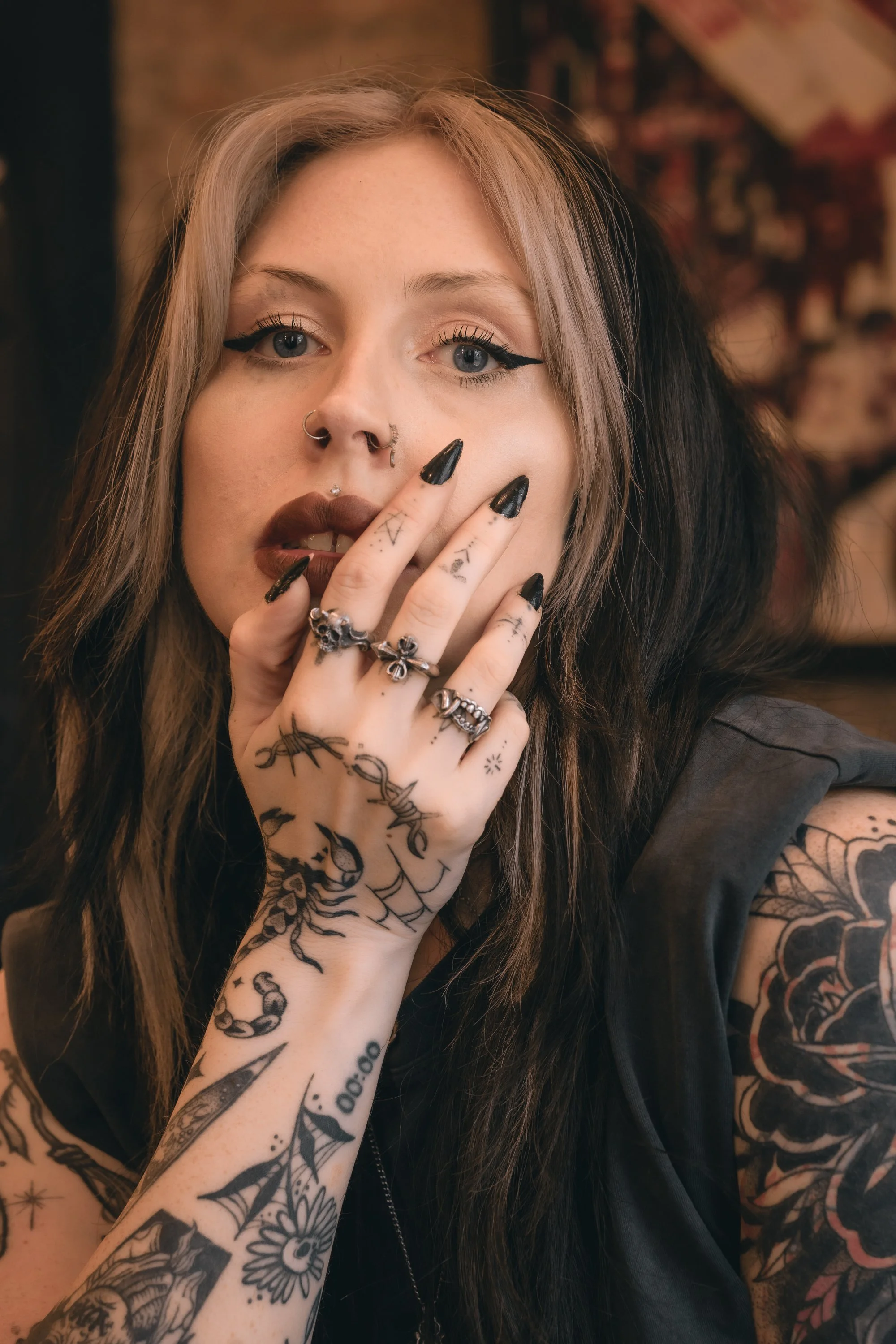Despite my shortcomings Meg shows these beautiful items off perfectly, and her tattoos add interest without taking away from the rings - they look like they were made for her. Also, can we talk about that scorpion?! What a way to lead your eye up to the jewellery that’s just catching the light.
