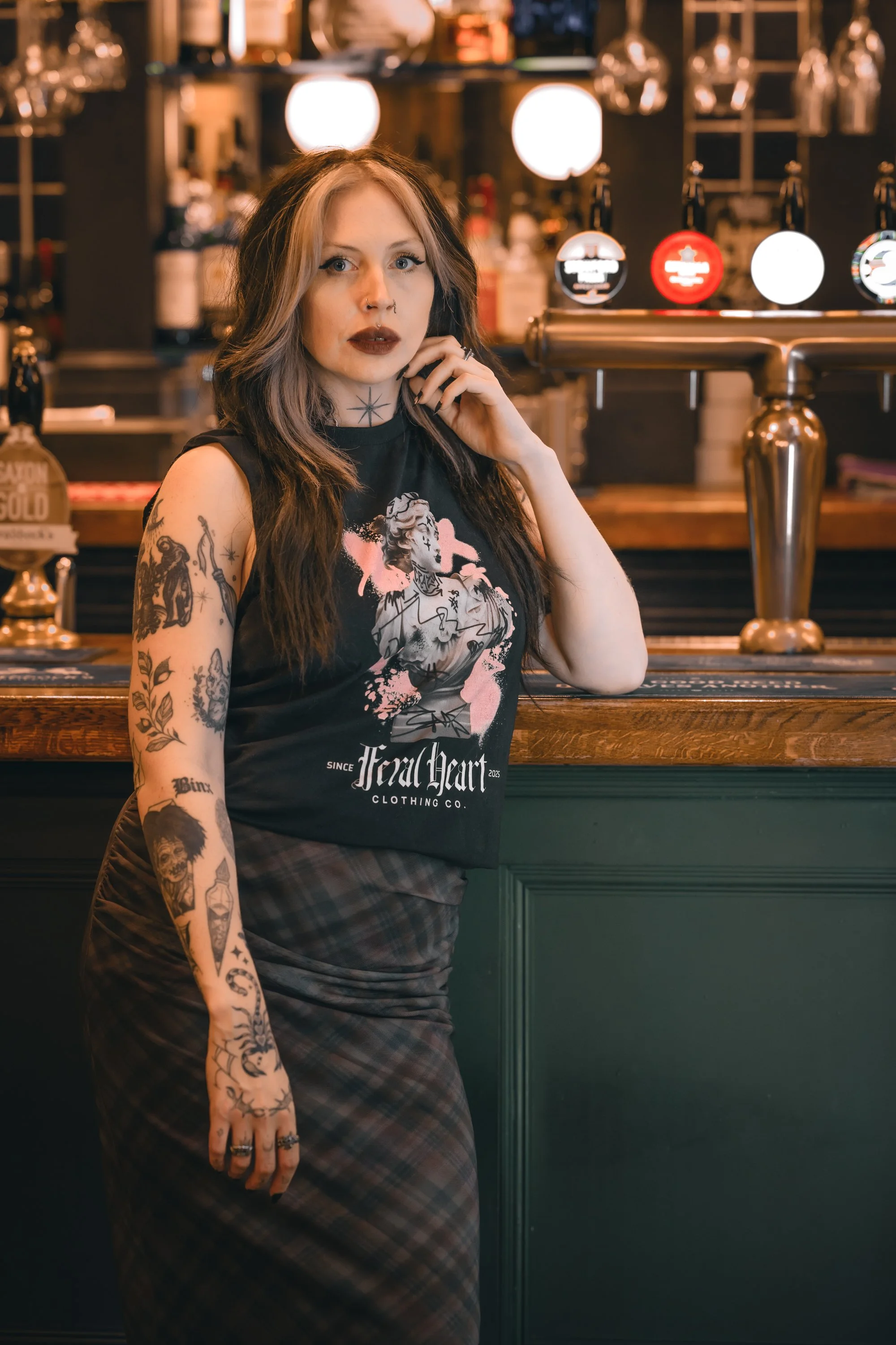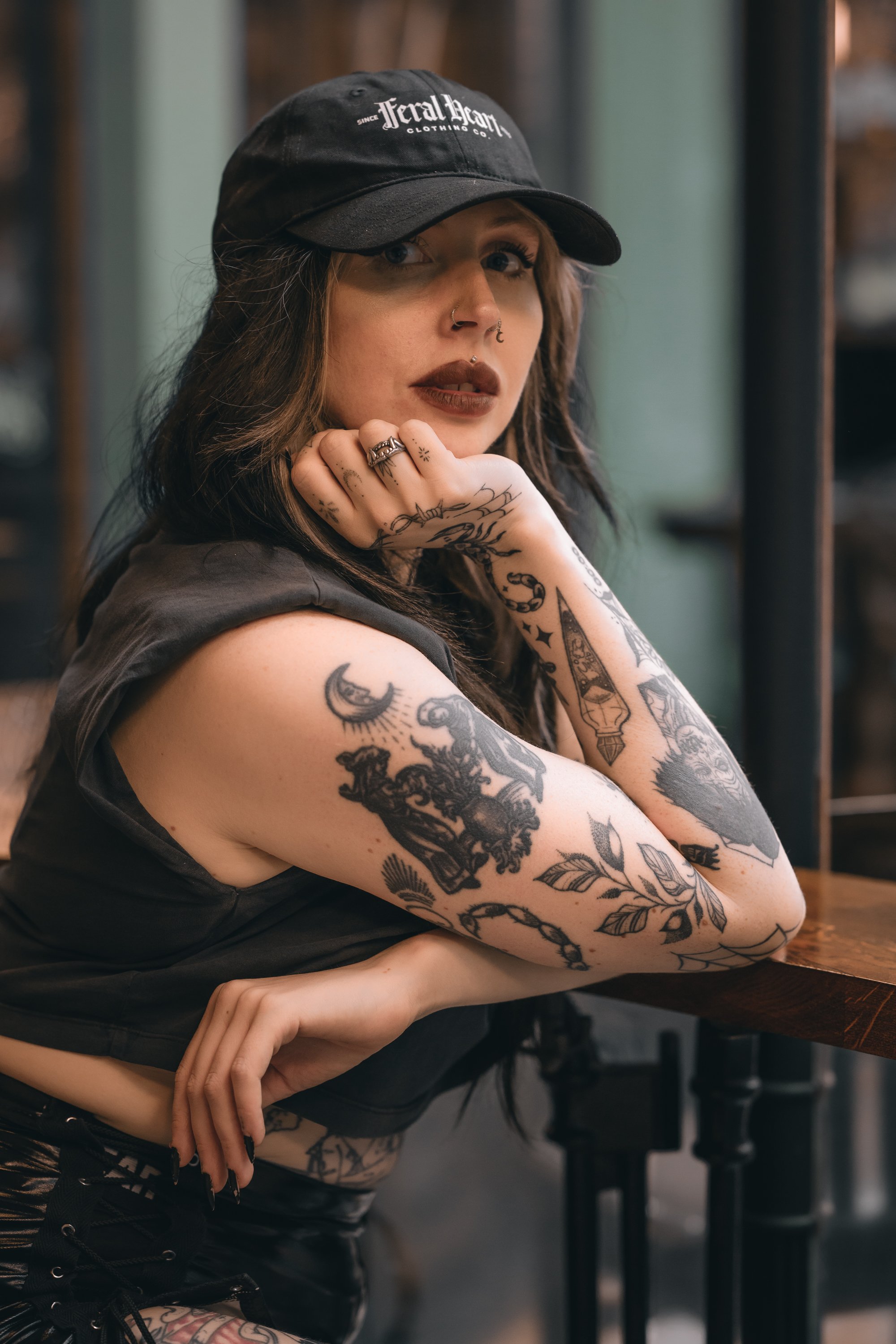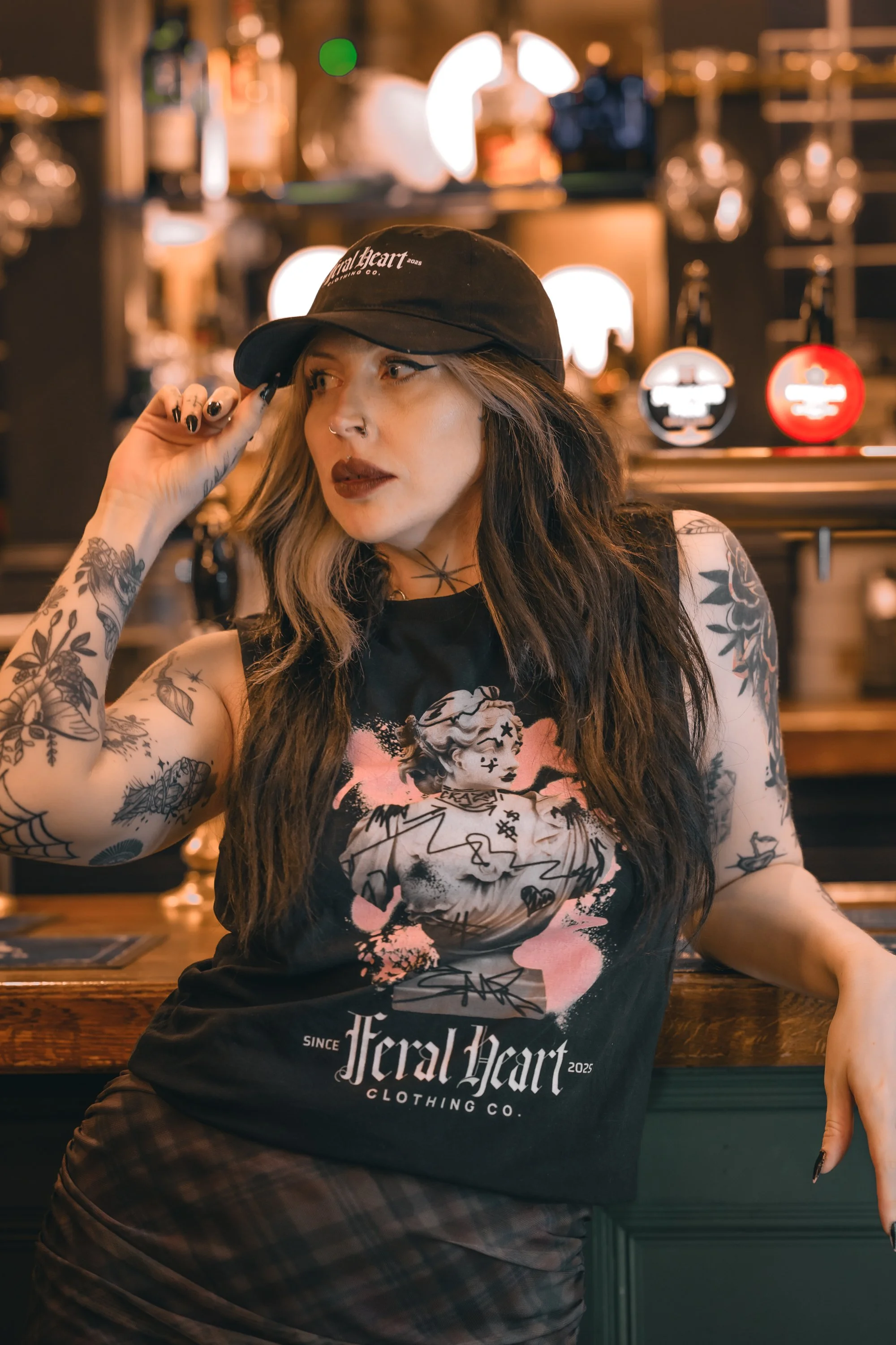 After taking the jewellery shots we made out way down into the bar to shoot more with Feral Heart Clothing Co’s vest and cap - absolutely perfect attire for this ridiculous heat. Will the barman even let us use the bar for this shot which I am in love with, I think everything works perfectly in it and even the pale pink of the design compliments the dark green of the bar. I also adore the shots we took in the snug area at the back of the downstairs bar; the light coming from above creates a moody vibe and Meg looks insanely gorgeous.